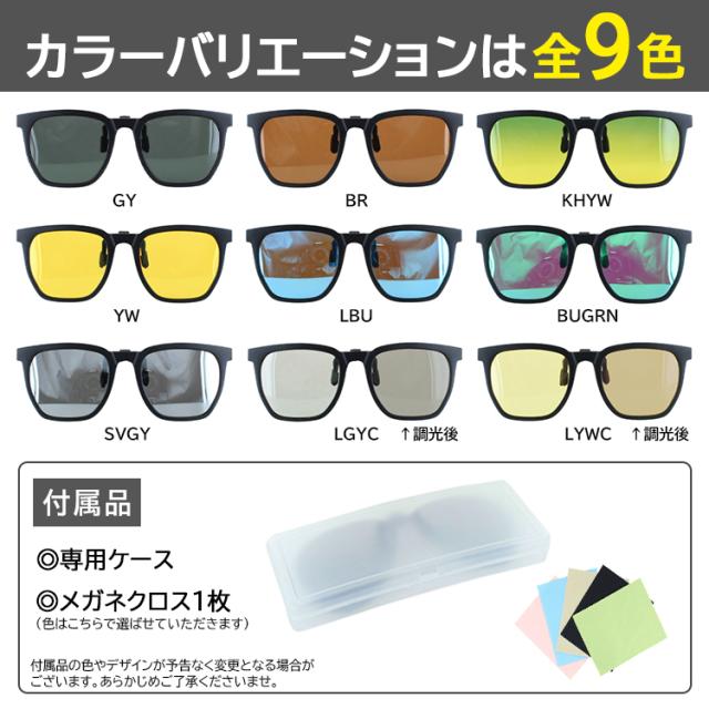 | ●レンズカラー GY グレー偏光 BR ブラウン偏光 KHYW カーキイエローグラデーション偏光 YW イエロー偏光(夜間対応) LBU ライトブルーミラー偏光 BUGRN ブルーグリーンミラー偏光 SVGY シルバーグレーミラー偏光 LGYC ライトグレー調光偏光 LYWC ライムイエロー調光偏光 ●フレームカラー(全カラー共通) マットブラック | ●素材 レンズ枠:プラスチック レンズ:プラスチック(偏光) 金具:メタル合金 ●仕様 跳ね上げ クリップタイプ ●可視光線透過率 グレー偏光 11% ブラウン偏光 14% カーキイエローグラデーション偏光 40% イエロー偏光 78% ライトブルーミラー偏光 9% ブルーグリーンミラー偏光 12% ライトグレー調光偏光 調光前38% -調光後25% ライムイエロー調光偏光 調光前70% -調光後 25% |