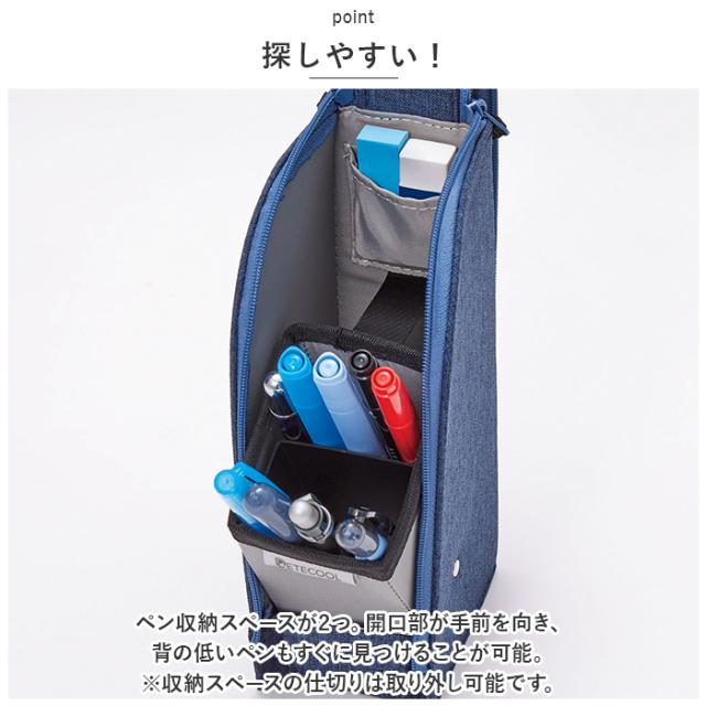 | 商品説明 | ・小物が探しやすく、取り出しやすい!使いやすさを追求した「デテクール ペンケース」が新登場。 【ファスナー&マグネット開口】 ・フタを開く時は、前面のダブルファスナーをサッと上げるだけ!前面&裏面下部に内蔵された磁石でしっかり固定できて、安定感ばっちり。 【ナナメに傾く快適ギミック】 ・内側のペンスタンド部分は、手前に引くだけでナナメ形状に!収納した文具類をサッと使えるのが嬉しい★ 【探しやすい!】 ・ペン収納スペースが2つ。開口部が手前を向き、背の低いペンもすぐに見つけることが可能。(※収納スペースの仕切りは取り外し可能です。) 【取り出しやすい!】 ・前傾しているので、見つけたペンの取り出しもラクラク。 【戻しやすい!】 ・スタンドに残ったペンは手前に寄るから、奥のスペースにスムーズに戻せちゃう! 【小物ポケット】 ・消しゴムなど細々としたモノを入れておける、オープンポケットが1つ。 【便利なループ付き】 ・持ち運びしやすい!指に通せるループハンドルを装備。 【省スペースなスタンドタイプ】 ・学校や学習塾での授業、テレワークなどで大活躍!いつでもどこでも、自分だけのペンスタンドに☆ |