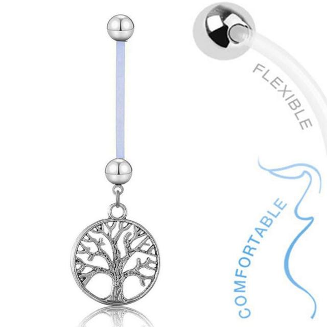 生命の樹(ツリー・オブ・ライフ)をモチーフにしたチャームを透明のクリアーのバイオプラストのシャフトにセットしたヘソピアスはシャフトが柔らかいソフトな素材なので、お腹が大きくなってきてホールが伸びてピアスホールに負担がかかる妊娠中の妊婦さんの臍ピアスにもおすすめのマタニティーボディピアス。