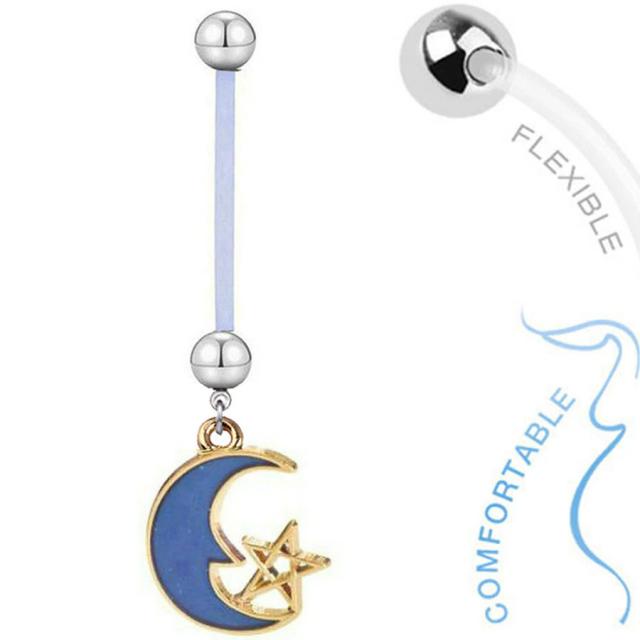 青色ブルーの三日月と五芒星スターのモチーフが揺れる14ゲージの柔らかいバイオプラストシャフトのへそピアス。