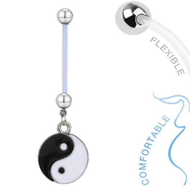 エスニックで人気の陰陽ロゴのチャームを透明のクリアーのバイオプラストのシャフトにセットしたヘソピアスはシャフトが柔らかいソフトな素材なので、お腹が大きくなってきてホールが伸びてピアスホールに負担がかかる妊娠中の妊婦さんの臍ピアスにもおすすめのマタニティーボディピアス。