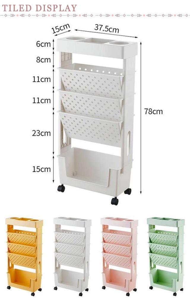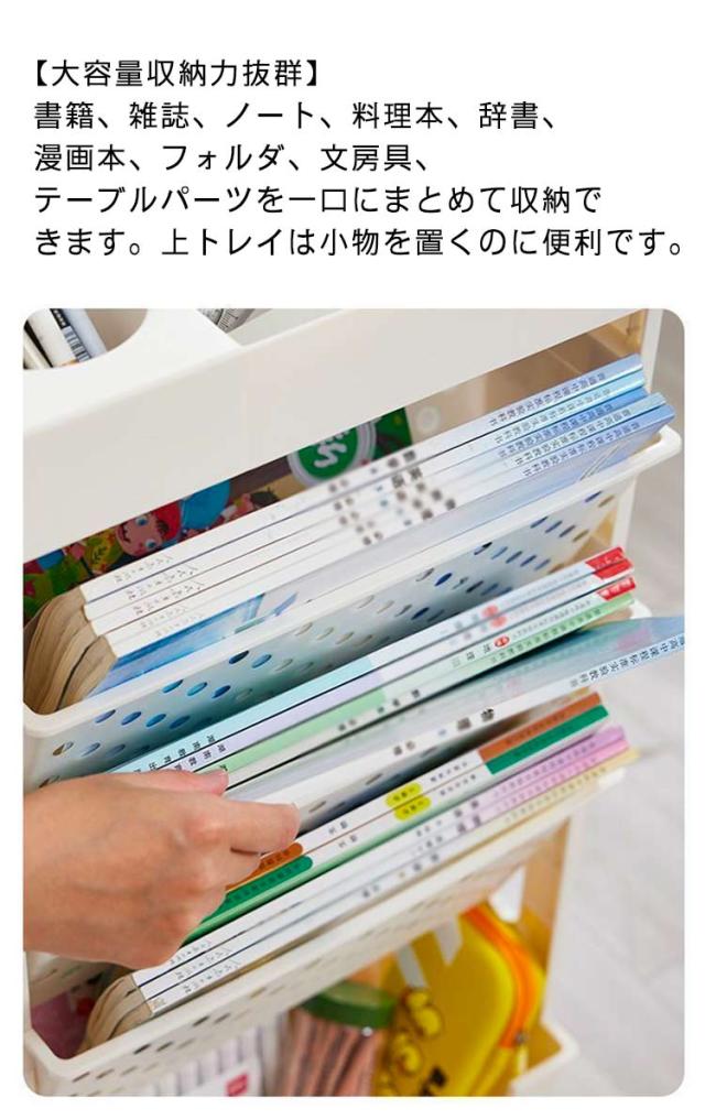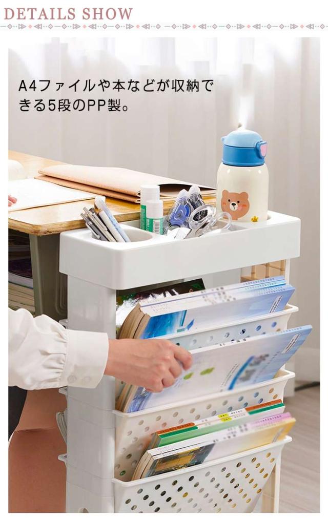 | 収納物の出し入れがやすい斜め構の棚板と移動に便利なキャスター付きファイルワゴン。両面収納可能 A4ファイルや本などが収納できる5段のPP製。 【安全な素材】環境にやさしいプラスチック、非塗装、非毒性、防水性、防湿、防カビ性、難燃性 【大容量収納力抜群】書籍、雑誌、ノート、料理本、辞書、漫画本、フォルダ、文房具、テーブルパーツを一口にまとめて収納できます。上トレイは小物を置くのに便利です。 【見せる収納】収納力として考えれられる方にはお勧めです。 【移動に便利なキャスター付き】キャスター付なのでスムーズに移動ができます。 【組み立て簡単】工具いらずの簡単組み立て!組み立ては各パーツを差し込むだけ。女性でも簡単に組み立てできます。 | |