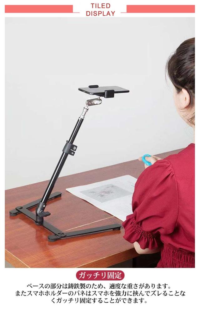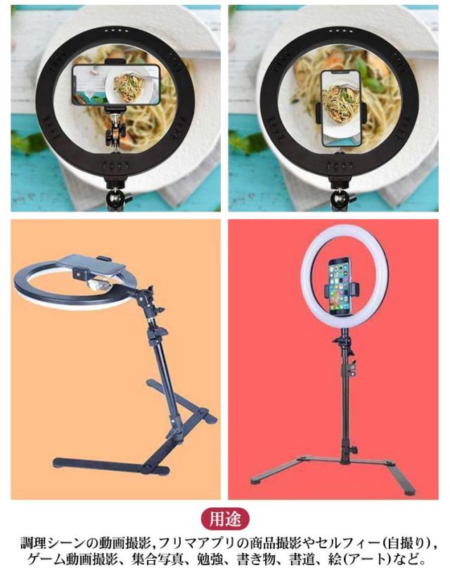 | 【ガッチリ固定】ベースの部分は鋳鉄製のため、適度な重さがあります。またスマホホルダーのバネはスマホを強力に挟んでズレることなくガッチリ固定することができます。 【角度・高さ調節可能】ベースの接続部分は前後180°調整可能で、高さは25〜45cm伸縮可能です。スマホホルダーの部分は360°調整可能です。 スマホの向きや角度や撮影する高さを変え、ブレることなく撮影することが出来る商品となっております。 【真中撮影】ライトは3色モード付き、10段階調整可能。スタンドは傾けて撮影できるので、足の部分が写り込んでしまう心配はなくなりません。 【用途】調理シーンの動画撮影,フリマアプリの商品撮影やセルフィー(自撮り),ゲーム動画撮影、集合写真,勉強,書き物,書道,絵(アート)など | |