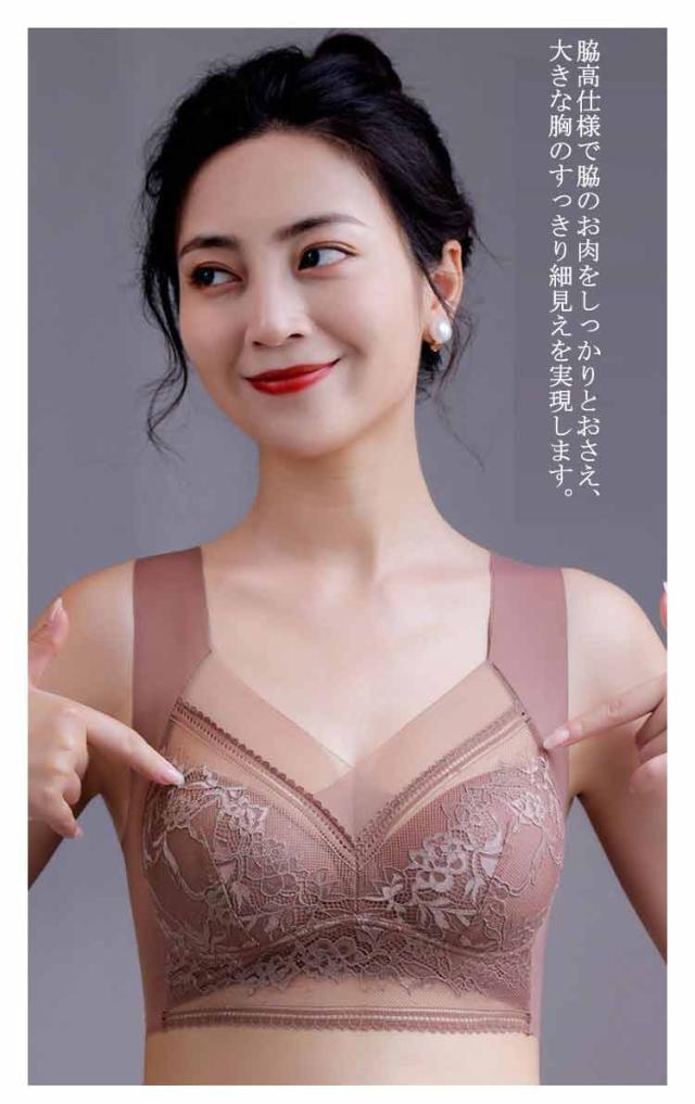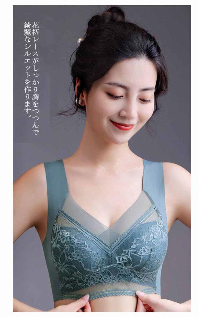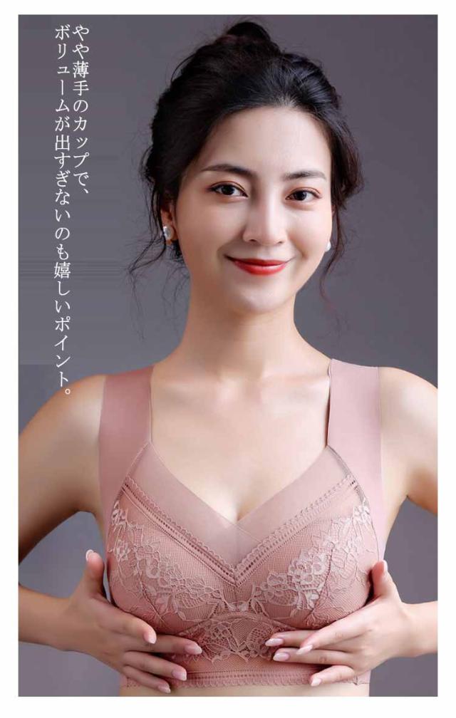 | 大きな胸を小さく見せるブラ。 伸びも良いのであらゆるバストを包み込みます。 やや薄手のカップで、ボリュームが出すぎないのも嬉しいポイント。 ノンワイヤーで窮屈感を軽減。 花柄レースがしっかり胸をつつんで綺麗なシルエットを作ります。 脇高仕様で脇のお肉をしっかりとおさえ、大きな胸のすっきり細見えを実現します。 ストラップも太目仕様なので、肩への食い込みも軽減されます。 特有のU字型バックストラップで背中をフラットに抑え、スッキリとした後ろ姿に。 | |