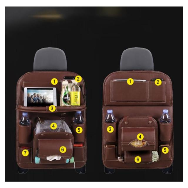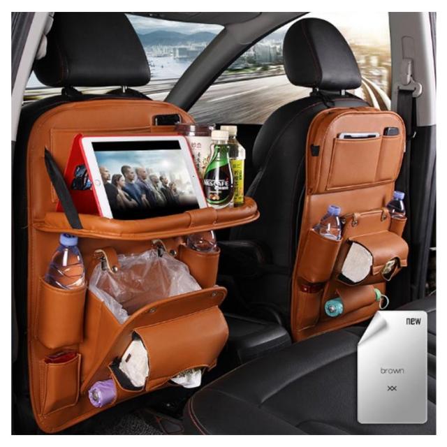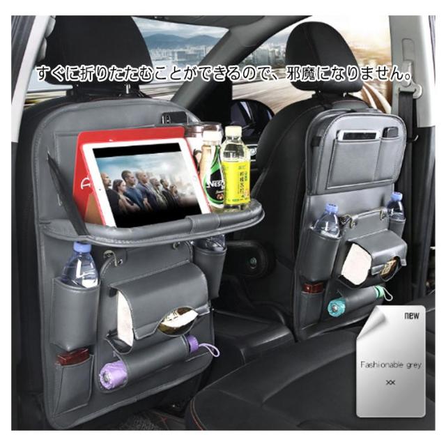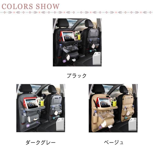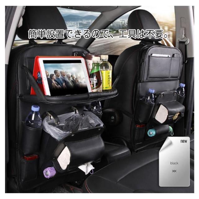 | ゴミ箱、テーブル付き!8ポケット収納付きのバックシートポケット。 後部座席の収納スペースを車のシートに簡単設置できる、収納力抜群のシートバックポケットです。 車内にテーブルを設置でき、スマホや飲み物やお菓子など置いて後部座席でのドライブを快適にできるシートバックポケット。 すぐに折りたたむことができるので、邪魔になりません。 レザー素材なので、汚れにくいのでお子様の靴の裏が触れても座席をガードできます。 外して水拭きすることも可能です。 簡単設置できるので、工具は不要。 | |