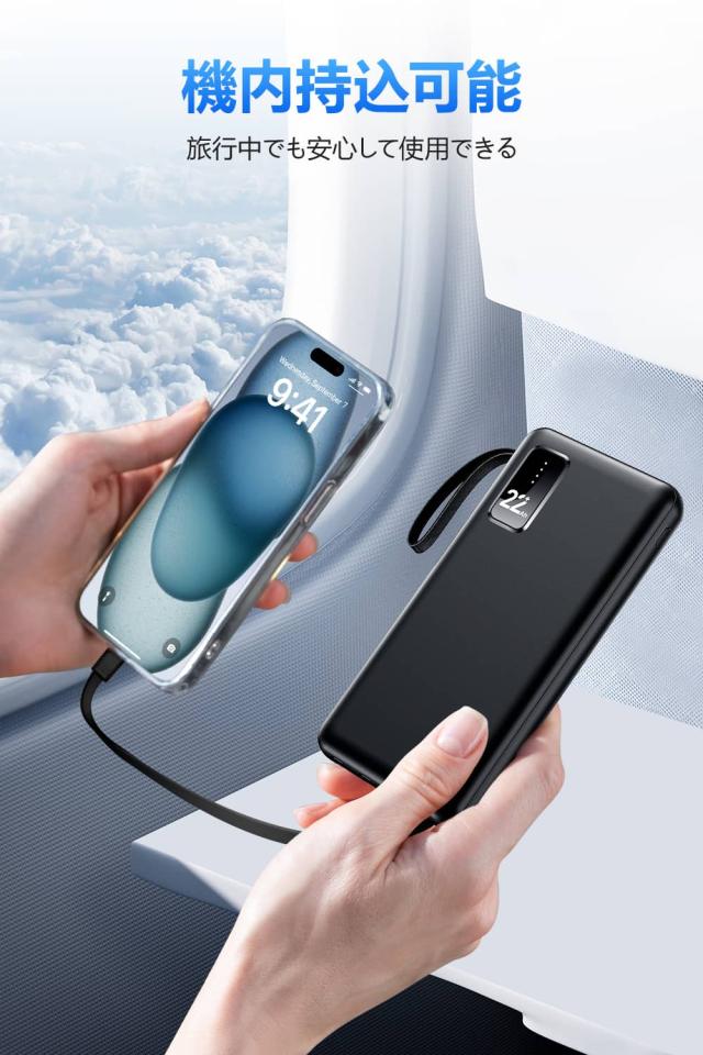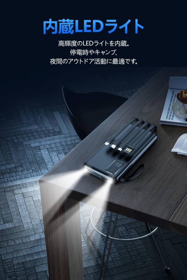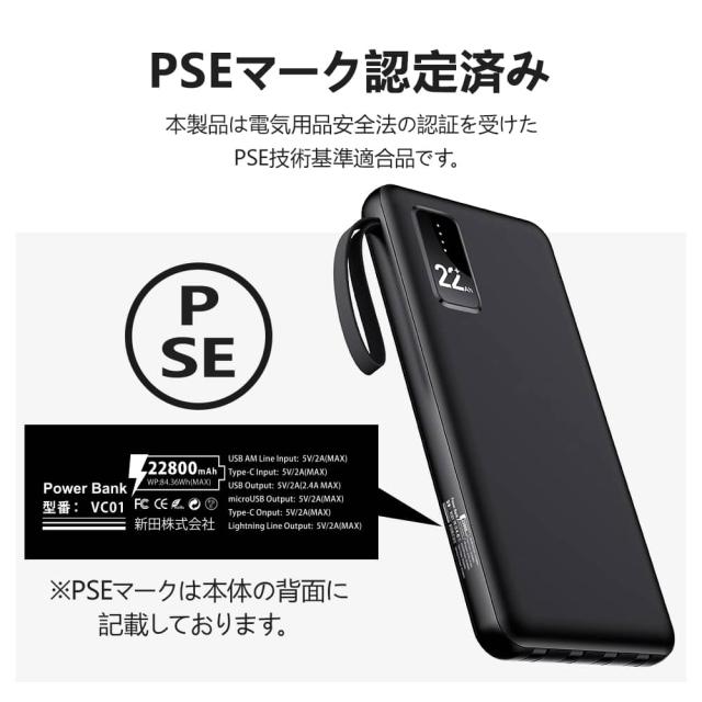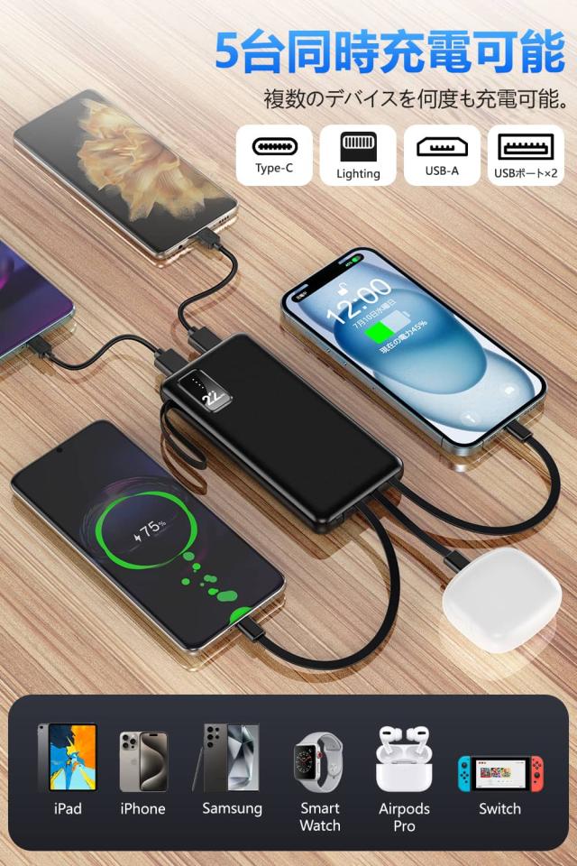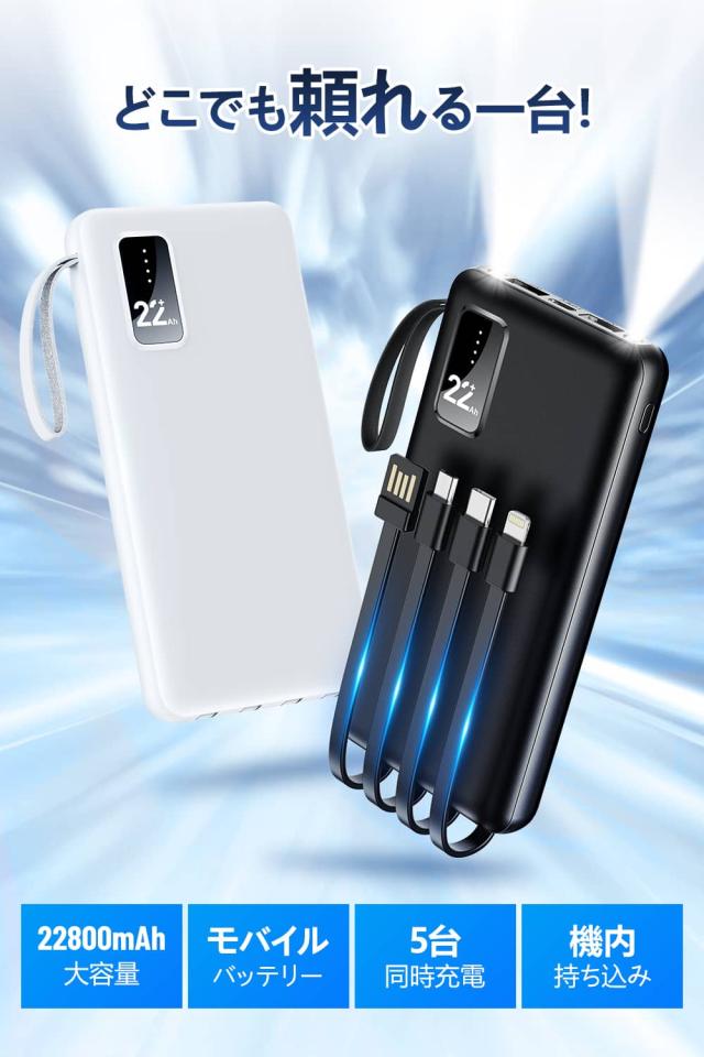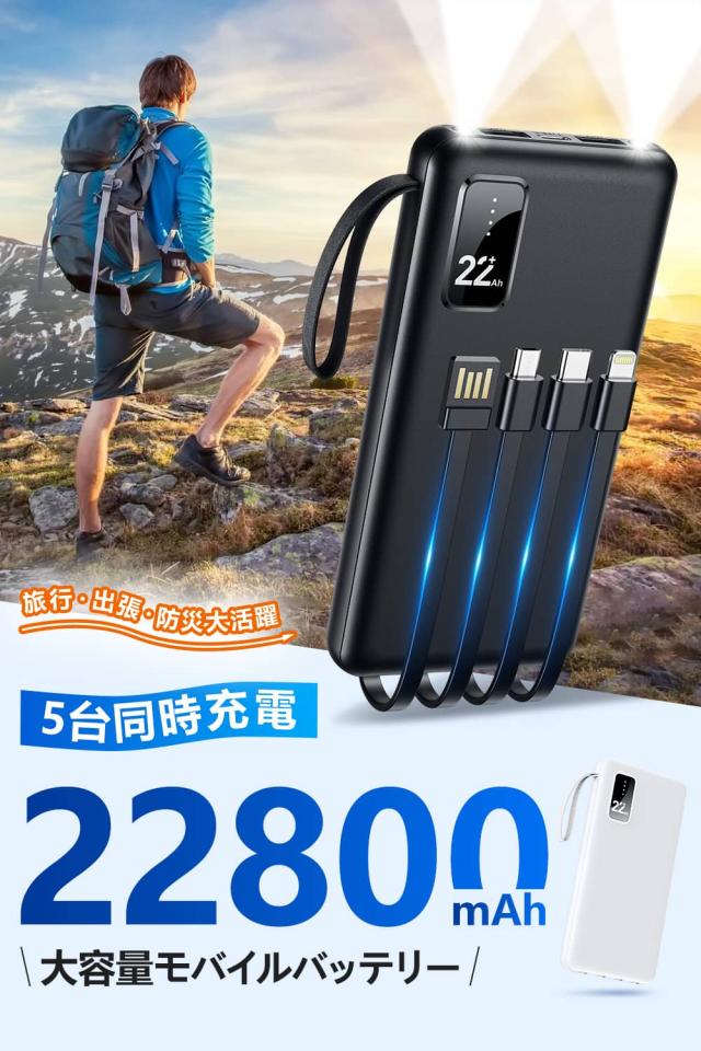 モバイルバッテリー 22800mAh 5台同時充電 軽量 大容量 コネクター内蔵 PSE スマホ携帯充電器 iPhone Android 送料無料