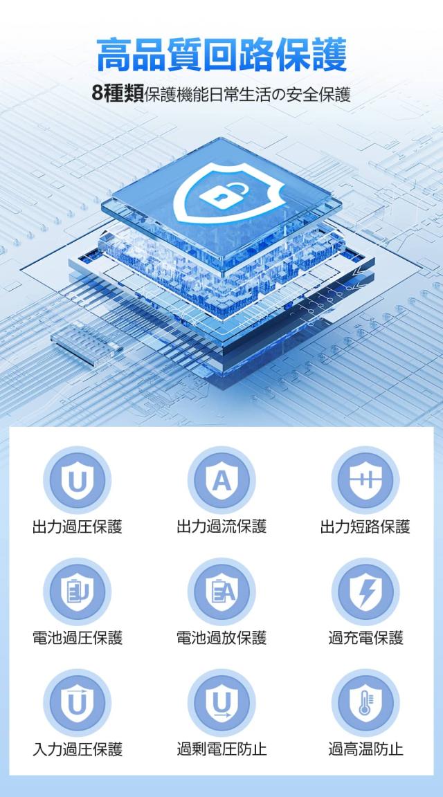 ・高性能ICチップと安全装置が内臓されており、モバイルバッテリーが過充電・過放電・過熱・ショートの際に、自動的に充電を停止してくれますので、安心して使うことができます。
