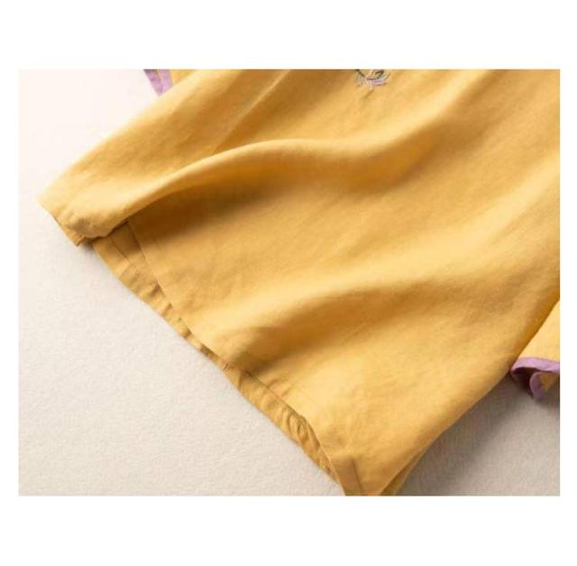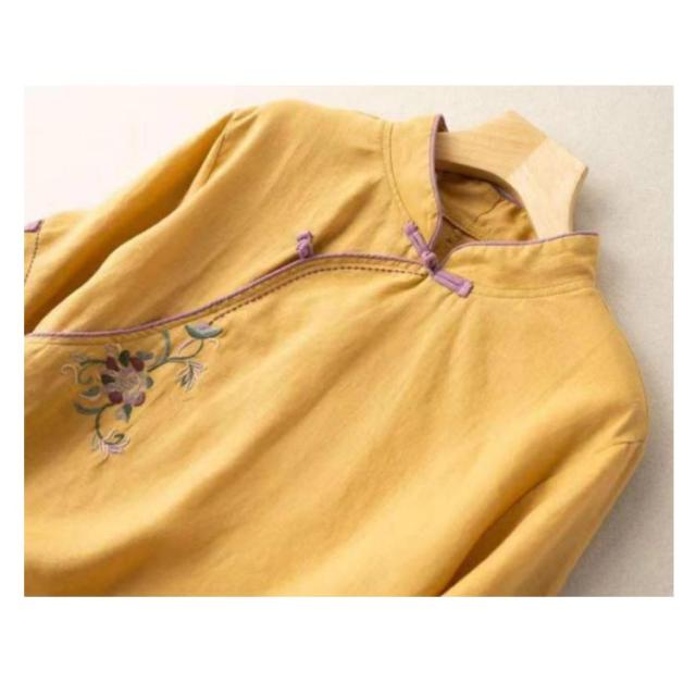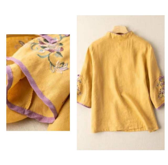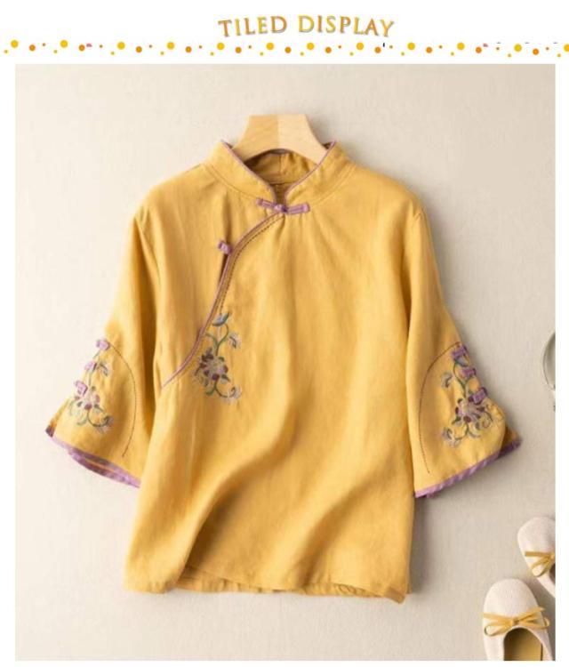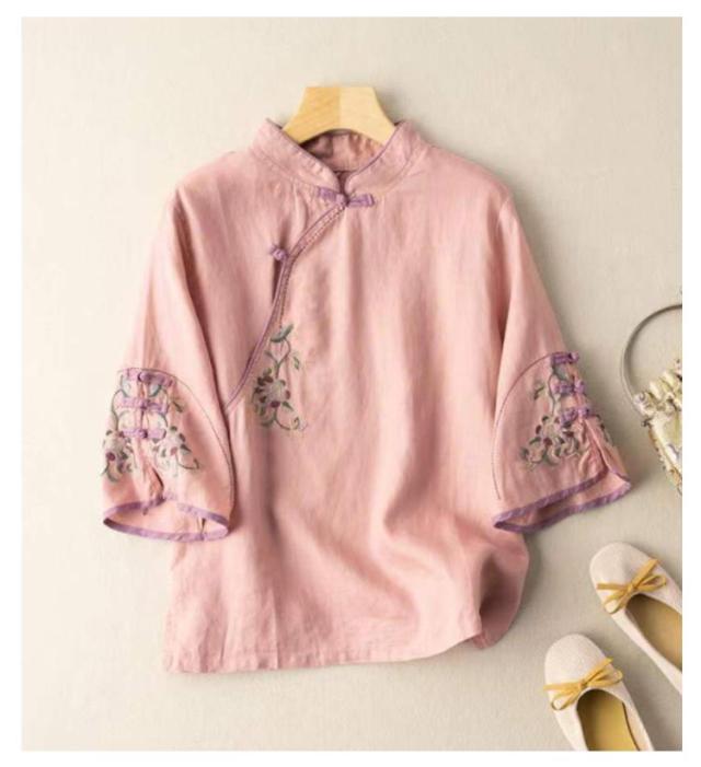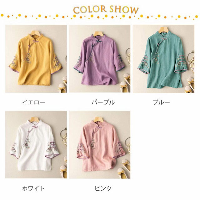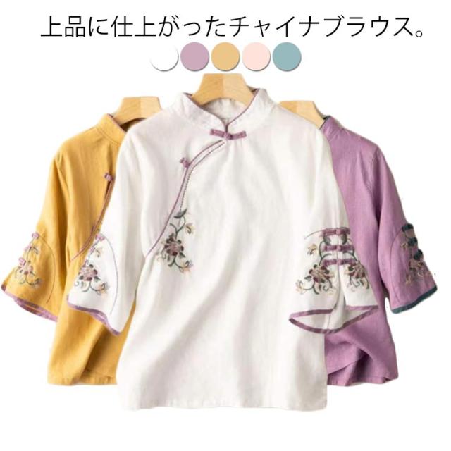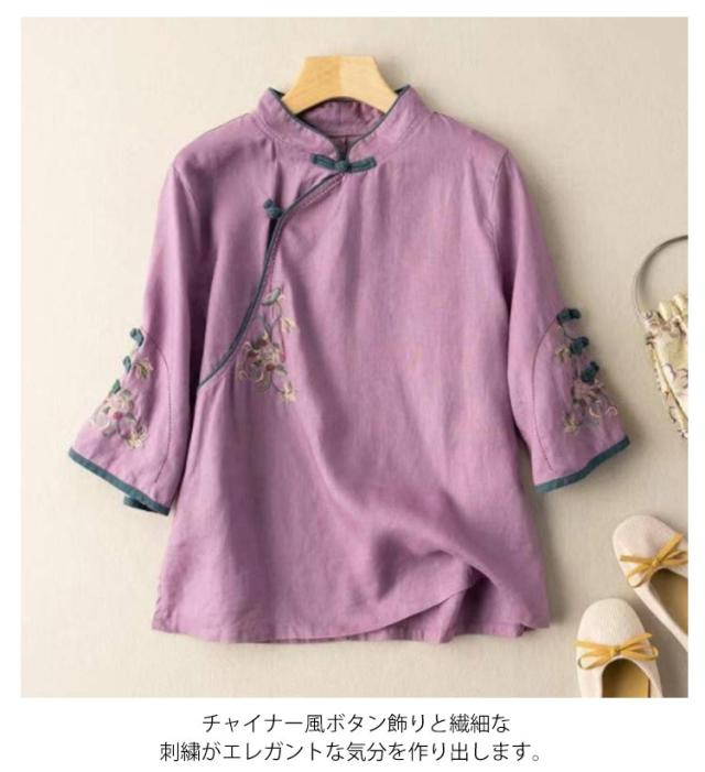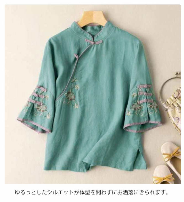 プルオーバー シャツ 七分袖 レディース 綿麻 チャイナブラウス 薄手 ゆったり 着痩せ レディース カジュアル リンネルブラウス トップス 夏 送料無料 立ち襟 刺繍