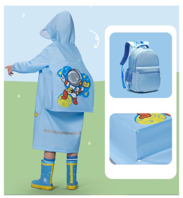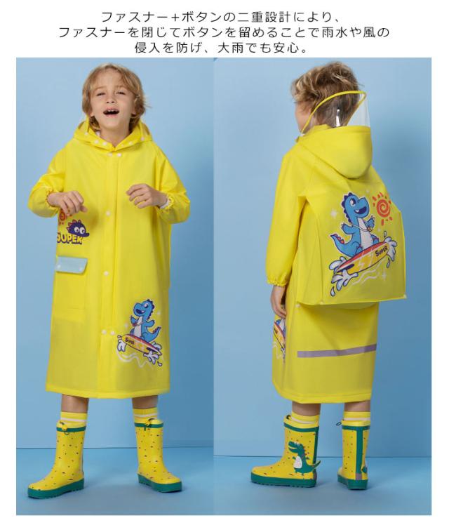 | ランドセルやリュック、通園カバンを背負ったまま着用可能だから、さっと着られてカバンなども濡れません。 フードのつばが透明になっているので、フードをかぶっても視界の確保ができます。 ファスナー+ボタンの二重設計により、ファスナーを閉じてボタンを留めることで雨水や風の侵入を防げ、大雨でも安心。 袖にはゴムが入っているため、しっかり留まって水の侵入を防ぎます。 後ろには反射テープ付きだから、暗い夜道も安全に歩行できます。 | |