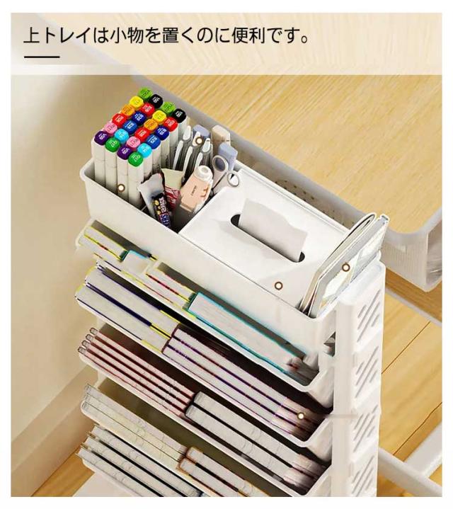 | A4ファイルや本などが収納できる5/6段のキャスター付きファイルワゴン。 収納物の出し入れがやすい斜め構の棚板と移動に便利なキャスター付き 【安全な素材】環境にやさしいプラスチック、非塗装、非毒性、防水性、防湿、防カビ性、難燃性 【大容量収納力抜群】書籍、雑誌、ノート、料理本、辞書、漫画本、フォルダ、文房具、テーブルパーツを一口にまとめて収納できます。上トレイは小物を置くのに便利です。 【見せる収納】収納力として考えれられる方にはお勧めです。 【移動に便利なキャスター付き】キャスター付なのでスムーズに移動ができます。 【組み立て簡単】工具いらずの簡単組み立て!組み立ては各パーツを差し込むだけ。女性でも簡単に組み立てできます。 | |
