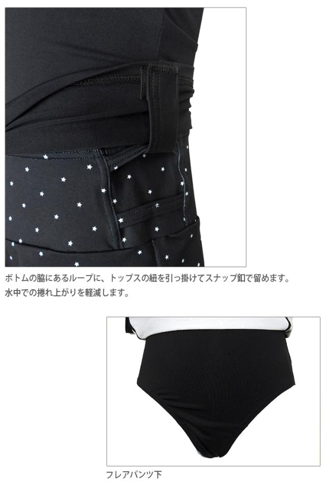 ボトムの脇にあるループにトップスの紐を引っ掛けてスナップ釦で留めると、水中での捲れ上がりを軽減します。