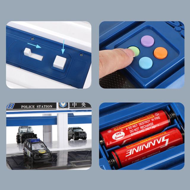 音声効果あり、スライド可のミニカー、障害物パーツなどを合わせて警察出動のごっこ遊びを楽にしよう。
