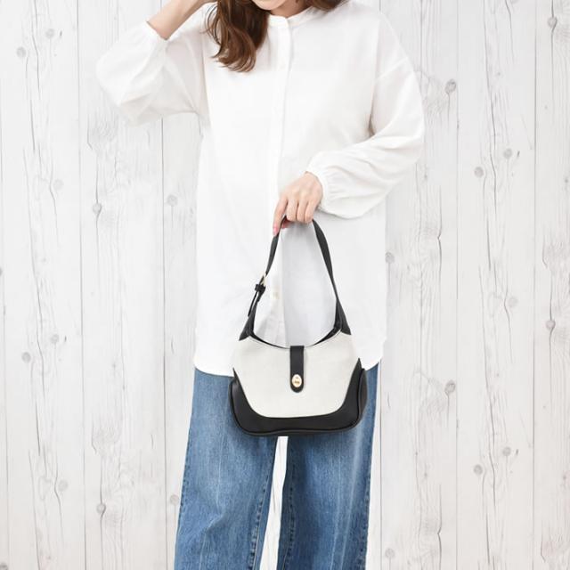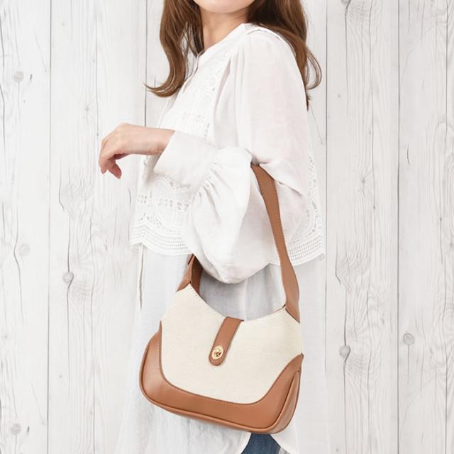 | 商品説明 | コロンと小ぶりなサイズが嬉しい、ワンショルダーバッグです。金具をひねって開閉するデザインですが、ファスナーもついているので中身が見えにくく安心♪小さめサイズなので、軽くてお洒落見え!トレンド感のある太めのショルダー紐がポイント!ナチュラルなキャンバス素材も、合皮とミックスすることで高級感のある雰囲気に仕上がりました。内側にはポケットが1つついているので、小物の整理もしやすいバッグです。 |