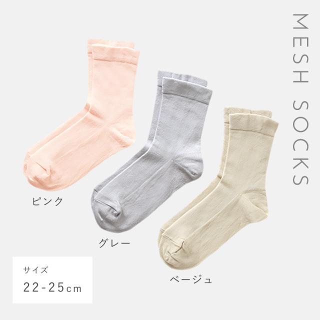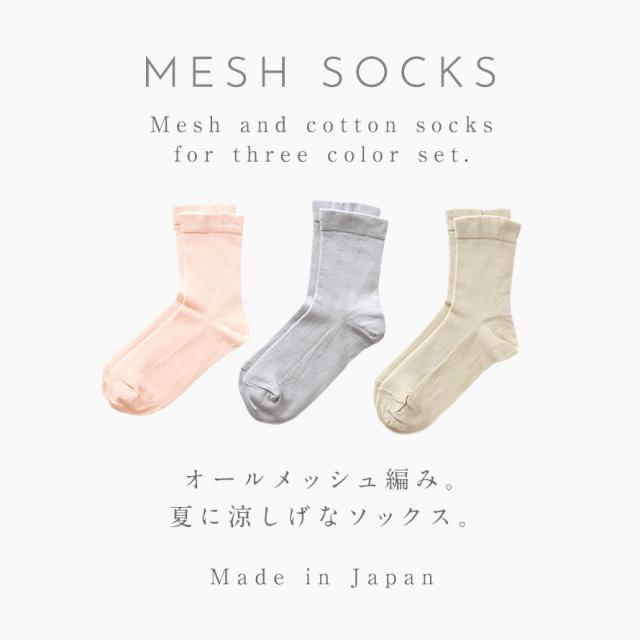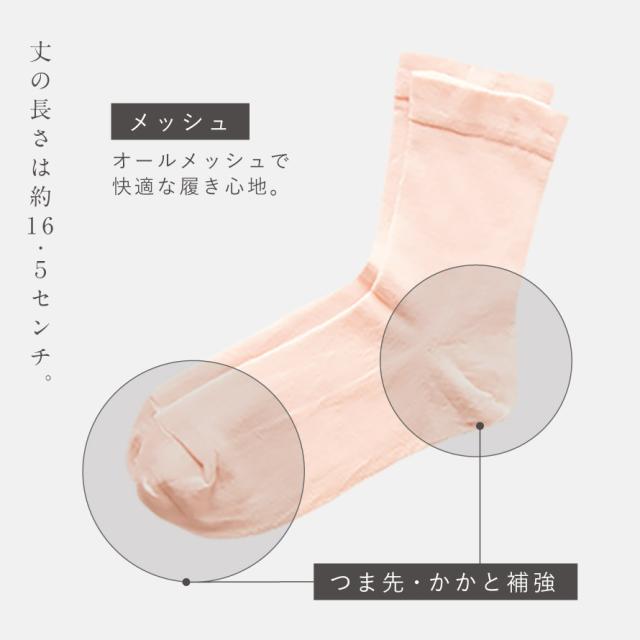 ガーゼ調+メッシュで涼しげ!風通し良いオールメッシュの夏ソックス。ふんわり柔らかなガーゼ調素材で、肌に気持ち良い。オールメッシュタイプなので、快適な履き心地です。