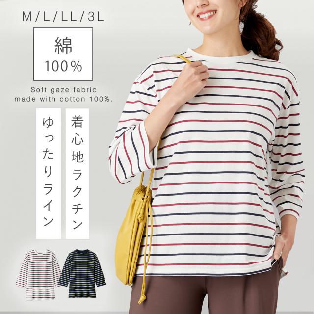 ボーダー tシャツ 綿100% コットン100% レディース 8分袖 トップス カットソー プルオーバー 春 夏 トップス きれいめ ゆったりマルチボーダー プルオーバー M L LL 3L 大きいサイズ ゆったり 50代 60代 70代 ミセス 婦人 ミセスファッション メール便対応
