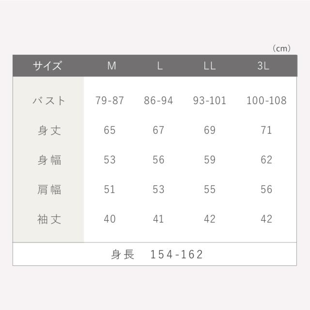 ■サイズ:身長154-162、M/バスト79-87、身丈65、身幅53、肩幅51、袖丈40、L/バスト86-94、身丈67、身幅56、肩幅53、袖丈41、LL/バスト93-101、身丈69、身幅59、肩幅55、袖丈42、3L/バスト100-108、身丈71、身幅62、肩幅56、袖丈42cm