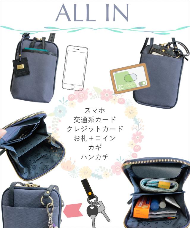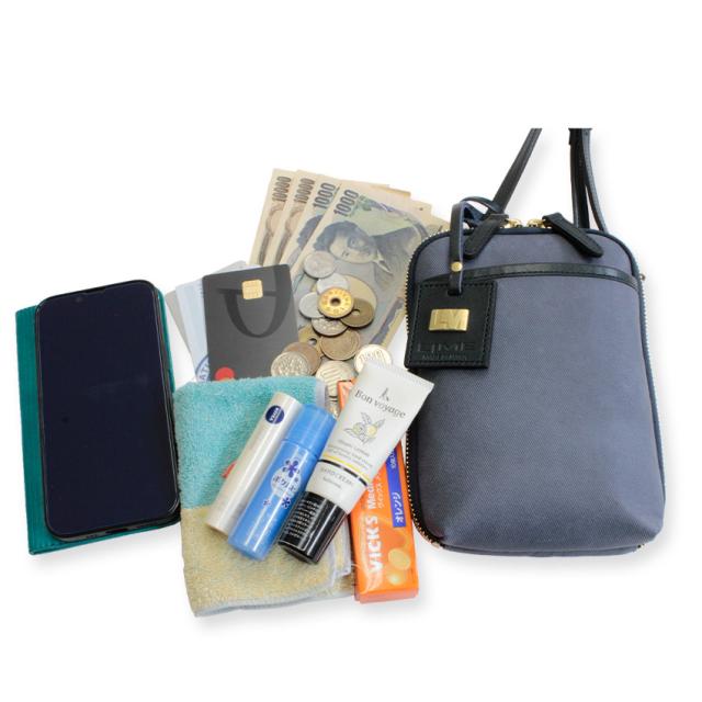 これ一つでスマートフォン、お金、カード、鍵、交通系ICカード、ハンカチ等必要最低限のアイテムをコンパクトに収納できます。