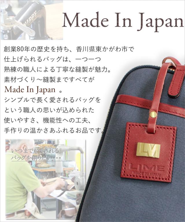 | ブランドについて | ライムのバッグは洗練された熟練の職人の方々の手作業により1本、1本丁寧に真心をこめて仕上げられています。 生産工場は香川県にあり全ての商品が国内生産。 日本でも希少なバッグ生産ラインを有し、クオリティを追求し続ける姿に誰もが感銘を受けるでしょう。 バッグ工房クレオは出会いました。 素敵なバッグに 素敵な職人さんに・・ |