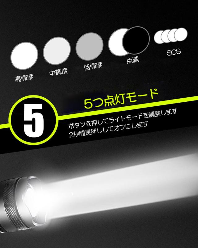 【5つの照明モード & 調節可能なフォーカス】5つの照明モードを備えた高ルーメン懐中電灯: 強/中/低/点滅/SOS、ズーム可能な懐中電灯でズーム可能な光を実現し、広い範囲の投光器やスポットライトを発します。 安全で信頼性が高く、使いやすいです。 キャンプ、登山、ハイキングなどに最適な懐中電灯です。