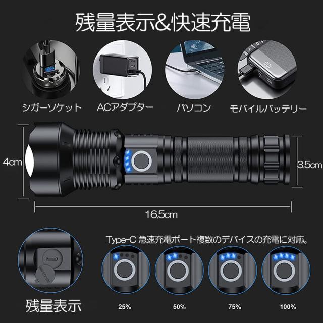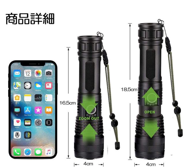 【10000 高ルーメン懐中電灯】耐久性のあるLEDチップ使用、最大ビーム距離500メートル (1640フィート) 、部屋全体を簡単に照らしたり、最大1600フィート離れたところの物に焦点を当てたりできます。 長距離観測に適した強烈スポットライト。【5つの照明モード & 調節可能なフォーカス】5つの照明モードを備えた高ルーメン懐中電灯: 強/中/低/点滅/SOS、ズーム可能な懐中電灯でズーム可能な光を実現し、広い範囲の投光器やスポットライトを発します。 安全で信頼性が高く、使いやすいです。 キャンプ、登山、ハイキングなどに最適な懐中電灯です。