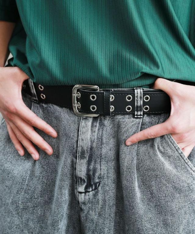 ダブルピンが存在感たっぷりな幅広のアイレットベルト。全面に配したアイレットで後ろ姿も抜かりなし。 パンツに合わせるのはもちろん、ニットやTシャツなどのウエストマークにもおすすめです。合わせやすいベーシックカラーに、ポイントとなるイエローや、クリアを合わせた5色展開。フリーサイズで男女問わず着用可能のアイテムです。