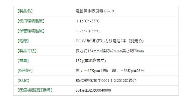 SS-19 電動鼻水吸引器 【乾電池式・単3電池2本(別売り)】 スペック情報