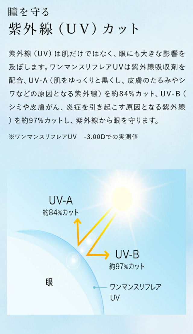 | UVカット | UVA 約84.6%カット/UVB 約97.6%カット (メーカー実測値-3.00Dの場合) |