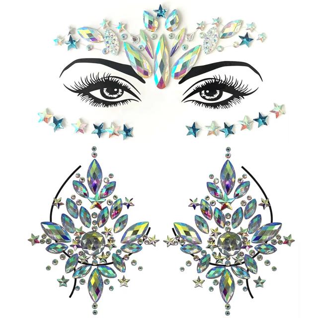 フェイス・チェスト セット(胸元用と顔・目元用セット) ジェムボディステッカー シート 貼る シール クリスタル メンズ レディース ダンサー ダンス 男子 女子 ボディアート メイク 胸 腕 顔 腹 ストーン 踊り子 レインボー 虹色 星 スター ティアドロップ 丸型