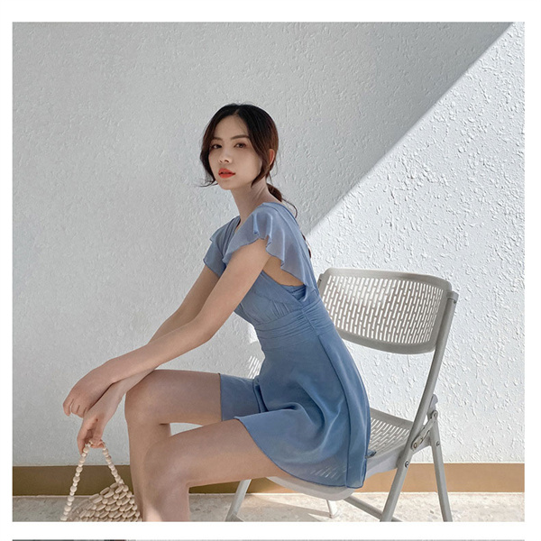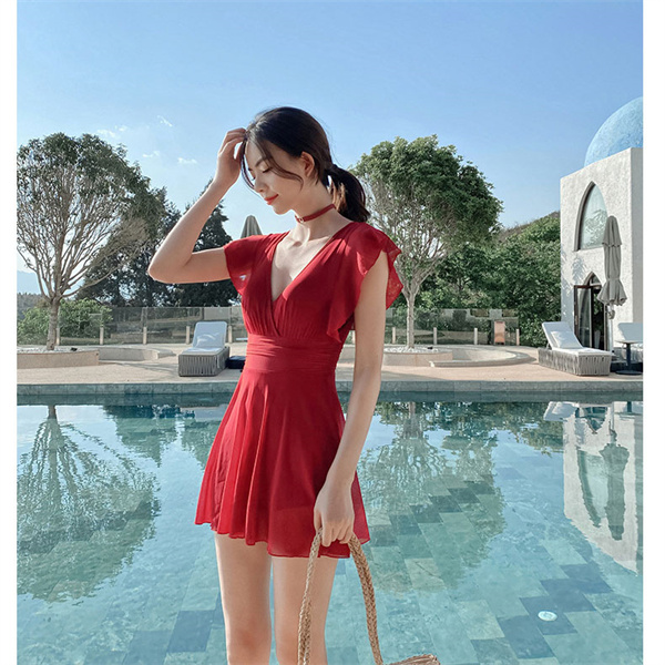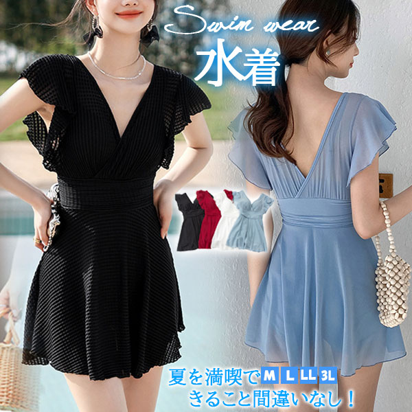 水着 ワンピース レディース Vネック スイムウェア 一体式 フレア セクシー 大きいサイズ 体型カバー かわいい シンプル 温泉 海 海水浴 水泳