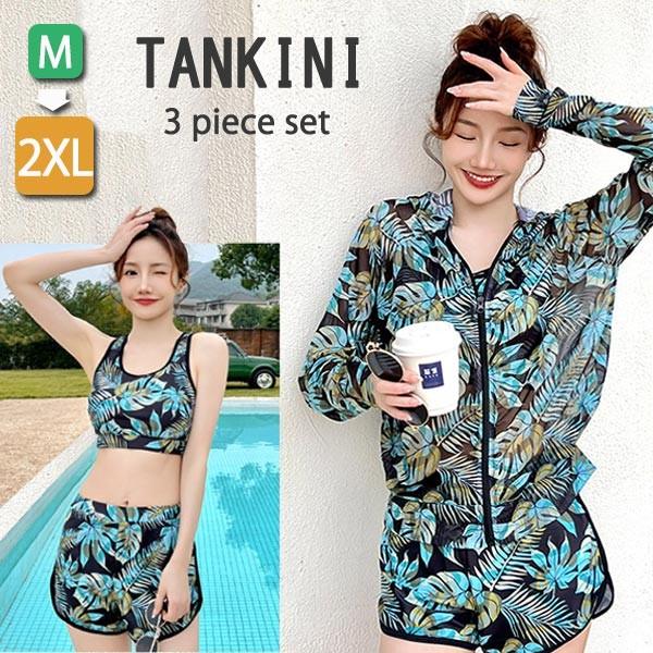 【送料無料】タンキニ 水着 レディース ラッシュガード 長袖 フード 大きいサイズ スポーツブラ ショートパンツ ハイウエスト ボーイレッグ ワイヤーなし パッド付 ボタニカル柄 葉柄 リーフ 体型カバー セパレート 海 プール リゾート おしゃれ