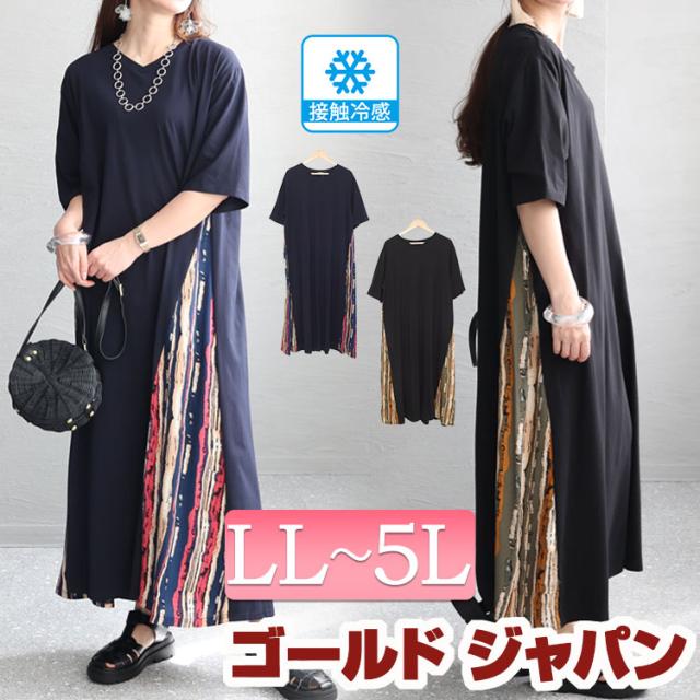 春新作 大きいサイズ レディース ワンピース 接触冷感脇切替ワンピース ワンピ ロングワンピース ロング マキシ Vネック 5分袖 接触冷感 クールタッチ 冷感 涼しい デザイン アート 柄 切替え ストレッチ 春服 夏服 LL 2L 3L 4L 5L ブラック 黒 ネイビー ゴールドジャパン
