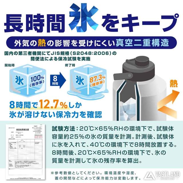 【氷を長時間キープ】真空二重構造により、外気の熱の影響を受けにくく、氷を長時間キープできます。国内の第三者機関にてJIS規格(S2048:2006)の簡便法による保冷試験を実施し、8時間で12.7%しか氷が溶けない保冷力を確認しています。