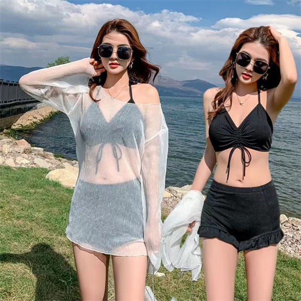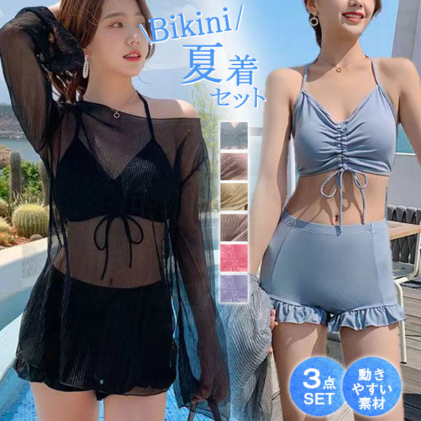 ポイント超超祭 水着 レディース 3点セット ビキニ水着 フリル 体型カバー セパレート 短パン水着 美肩 スイムウェア ホルターネックトップス 小胸バンドゥ