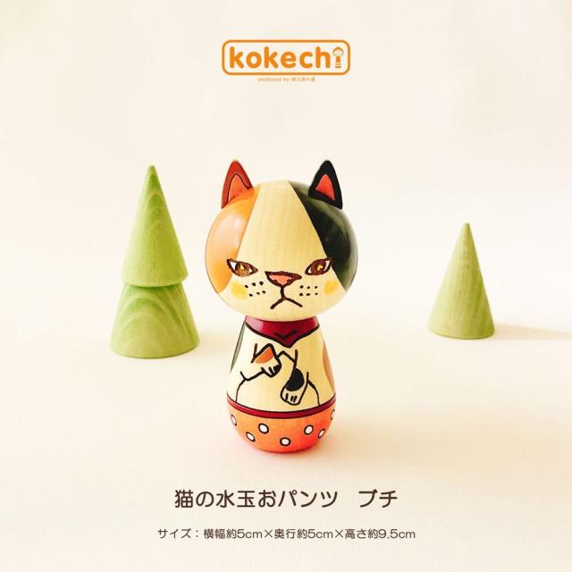 水玉の柄パンツがとってもキュート、ちょっと手招きをしている猫のこけし。お手に取っていただいた方にとっても、お気に入りのお人形になってほしい。そんな想いをこめて作ったシリーズです。
