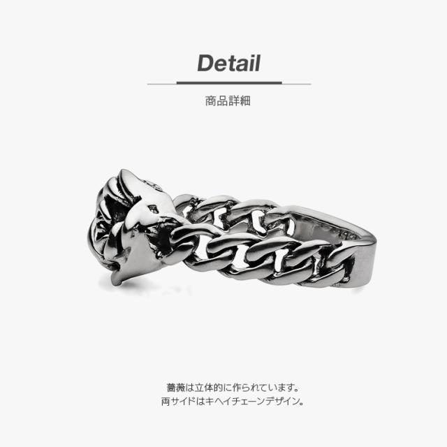 大きく立体的に作られたバラがデザインされたシルバーリングです。薔薇の両脇はキヘイチェーンのデザイン。シンプルながら存在感のあるデザインで、あなたの指先を美しく飾ります。バラは、古代ギリシャやローマの神話に由来する愛と美と栄光と成功のシンボルです。薔薇にはトゲがあることから魔除けの力もあり、幸せを守るお守りとなっています。素材は、本格的な仕様のシルバー925で作られています。