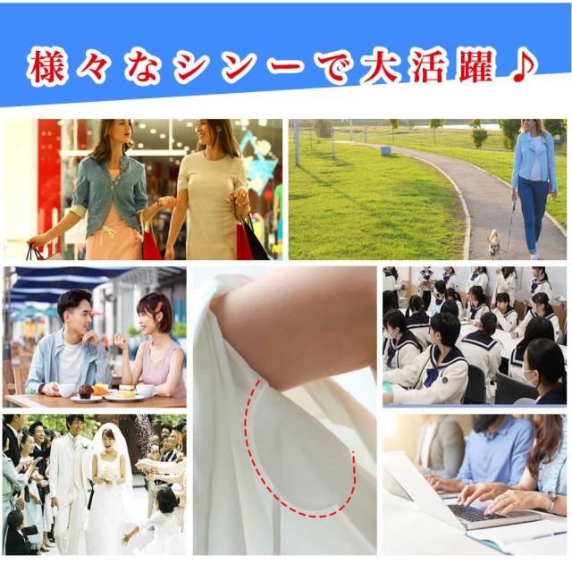 ●脇汗パッドはメッシュ素材を採用しておりますので汗をすばやく引き込み、べたつきにくい、吸いとった後もとじこめてもらさないから汗ジミをしっかり防ぎます。あせワキパットは長方形のりテープを採用,衣類が伸縮してもズレにくく、しっかりフィット!