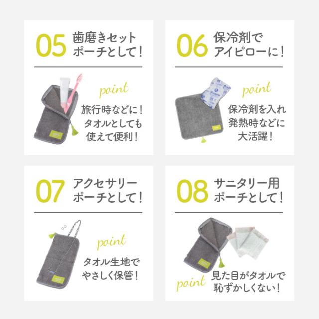 | 商品説明 | ・タオルのふりしてコソッとポーチ!ふわふわパイルの肌触りが優しい「どっとポーチNoble」が新登場。 【ファスナーを開いて変身!】 ・パッと見はふわふわコットンのタオルハンカチ、ファスナーを広げると便利なミニポーチに変身!どっとポーチは、ミニタオルにファスナーをプラスしたありそうでなかったポーチ。 【濡れているものをカバー】 ・吸水性に優れたコットンパイル生地が、冷たいペットボトル、濡れた折りたたみ傘の水滴を吸い取って優しくカバー。 【+保冷剤でアイピロー】 ・内側に保冷剤を入れてアイピローにすれば、発熱時のクールダウンやほっとリラックスしたい時に大活躍。 【隠したいものをさりげなく】 ・ファスナーがきちんと閉まるから、サニタリーポーチなど隠したいものをさりげなく持ち歩くのに最適。 【ご家庭で簡単お洗濯】 ・ナチュラルなコットン素材なので、ご家庭で手軽にお洗濯ができるのも嬉しいポイント。 【使い方は自分次第♪】 ・ペンケースやコスメポーチ、不織布マスク用ポーチなど、使い方は自分次第! 【大人のNobleシリーズ】 ・高貴な・気高い・気品のあるといった意味のある「Noble」。普段使いするものにも、ちょっといいものを使いたい。そんな方のためのシンプルで洗練されたデザインをラインナップ。 |