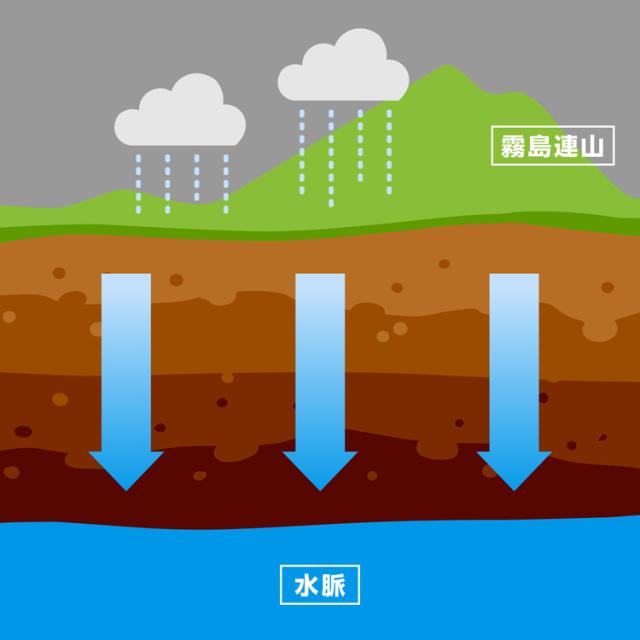 ●霧島神宮が鎮座する国立公園敷地内地下144mから採水。幾重もの固い岩盤層を浸透する過程により、希少なミネラル成分の「シリカ」や「サルフェート」を多く含有しています。