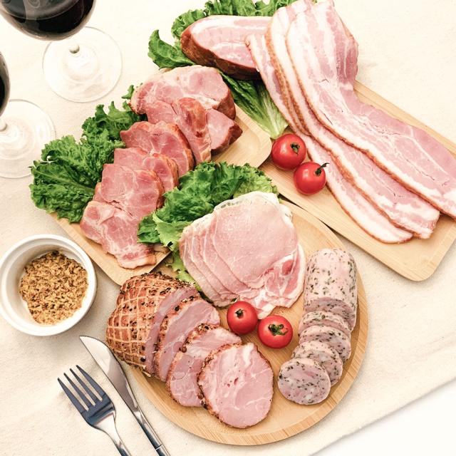 ○内容量:パストラミポーク250g×1、ベーコンブロック250g×1、ヤキブタ250g×1、ハーブローフ160g×1、生ハム60g×1