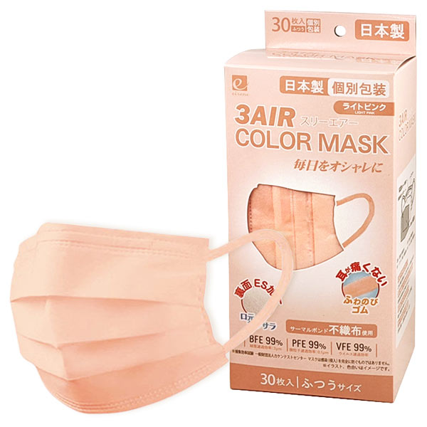 3AIR COLOR MASK ふつう ライトピンク(30枚入) 不織布マスク 日本製 使い捨てマスク 高密度フィルター ノーズワイヤー 飛沫 花粉 ほこり