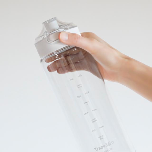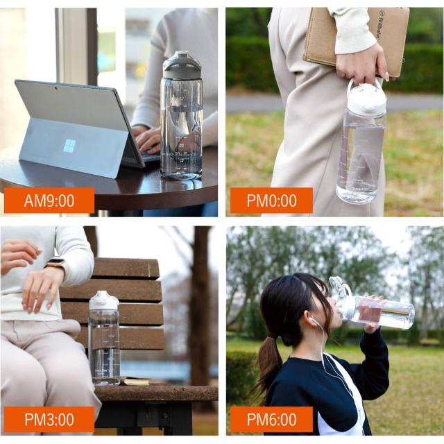 本体に時間のメモリがついていて、水分摂取の時間と量を教えてくれるボトルです。書いている時間通りに水分摂取することで飲み忘れを防ぎ、水分摂取量を測定できます。