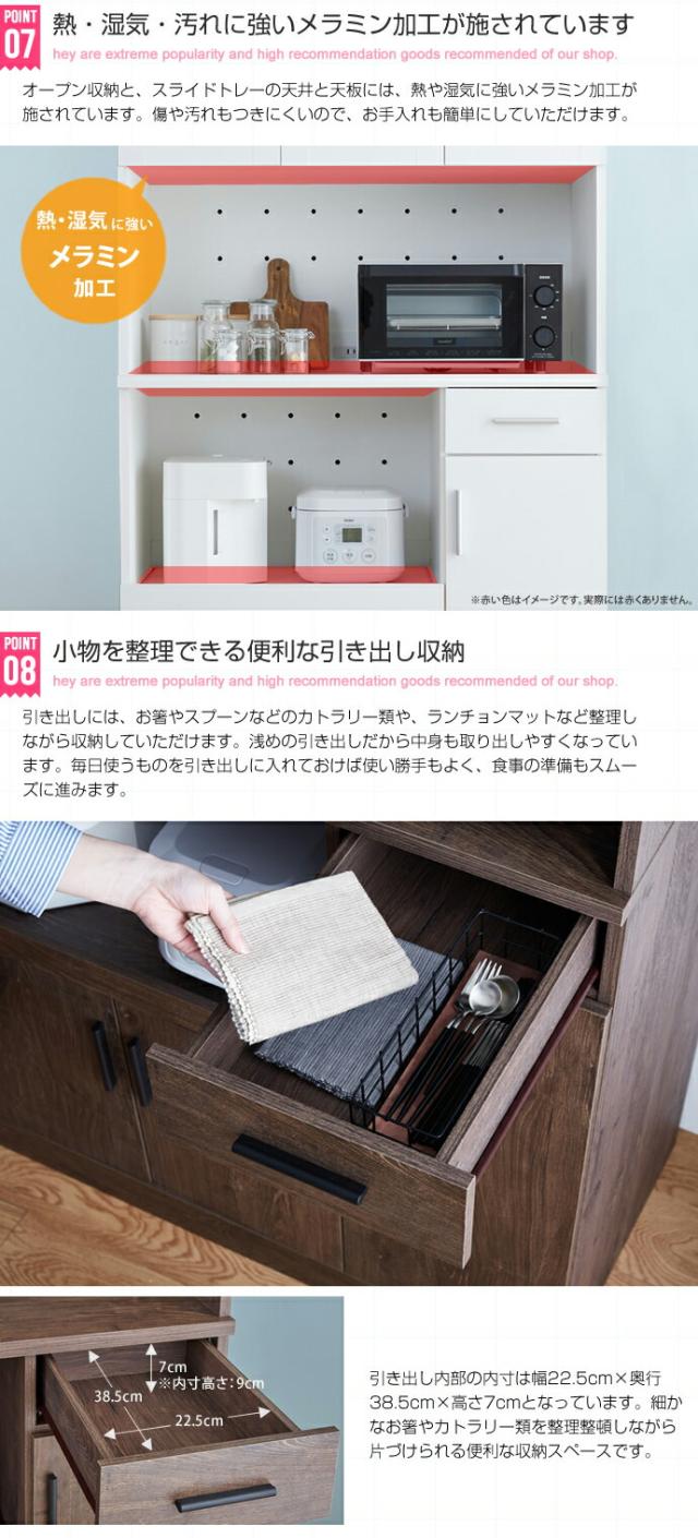 オープン収納とスライド棚の天井と天板部分は熱や湿気に強いメラミン加工。