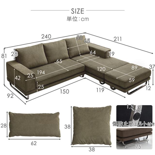 コーナーソファ 3人掛け ソファ 洗える ソファー カウチソファ カウチソファー コーナーソファー スチール 脚 3人 4人 4人掛 4人掛け l字 L型 北欧 おしゃれ ブラウン グレー グリーン アイボリー