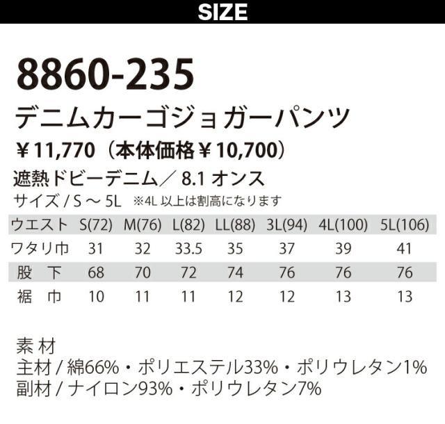 2023年寅壱新作 遮熱 吸汗 デニムカーゴジョガーパンツ 8860-235 ストレッチ 作業着 作業服 春夏 サマーパンツ かっこいい おしゃれ メンズ
