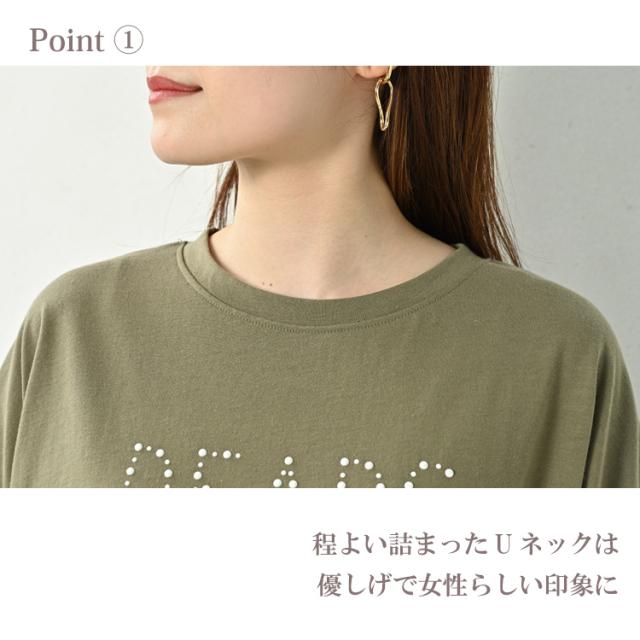 【メール便対応】抜け感がありながらラフ過ぎないシルエットのパールロゴTシャツ。 半袖トップス 30代 40代 50代 春服 夏服 春物 夏物 2023 ロゴT ドルマンT 春T 夏T 二の腕カバー おしゃれ きれいめ かわいい ゆったりサイズ ぽっちゃり女子 プラスサイズ 大きいサイズ レディース 半袖トップス 半袖Tシャツ 半袖カットソー 半袖プルオーバー ドルマンTシャツ ロゴTシャツ パールビーズ パールロゴ スタッズロゴ Uネック クルーネック ラウンドネック 丸首 ドルマンT ドルマンスリーブ ラウンドヘム 春服 夏服 春物 夏物 春トップス 夏トップス 春Tシャツ 夏Tシャツ お尻くらいの着丈 カットソー 二の腕カバー ゆったり 大きめ 大人 カジュアル フェミニン リラックス ナチュラル きれいめ かわいい 着こなし おしゃれ 定番 春コーデ 夏コーデ ファッション 大きめ 女性 婦人用 ミセス 30代 40代 50代 2023 春 夏 白 黒 緑 グリーン カーキ M LL 3L 4L 5L 9号 13号 15号 17号 19号 coe-ss-tp0165