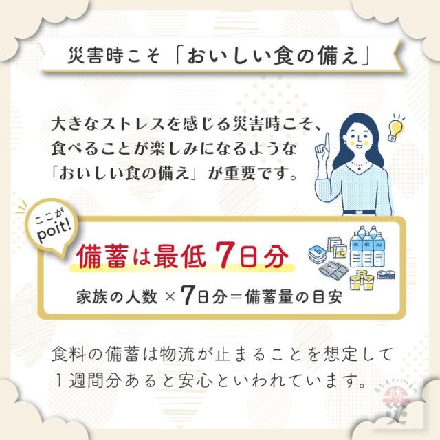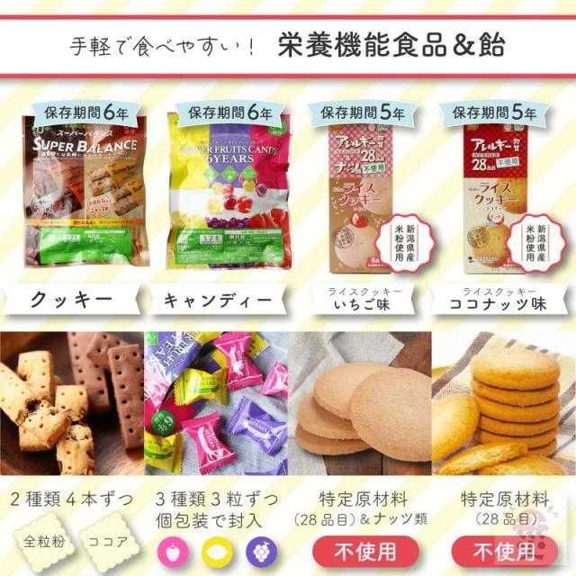 - 個人で数種類、ホームセンターで購入しましたが、割高、おやつ類の長期間品は手に入りませんでした。多様な品数は精神的にもたすかります。 一つ、フリーズドライのスープ、お味噌汁があればより良かったと思いま...