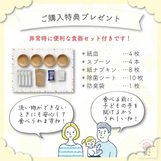 | 限定特典 | 食器セット(紙皿 4枚、プラスプーン 4個、紙ナプキン 8枚、除菌シート 10枚入1個、防臭ゴミ袋 1枚) | |