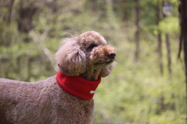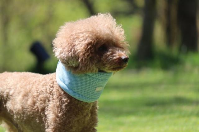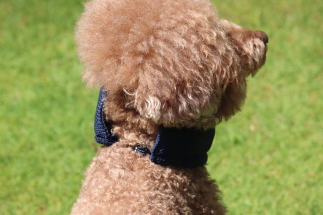 スタンダードプードルのモカ(30キロ)はLサイズを着用しています。