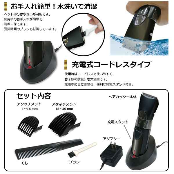 清潔な水洗いOK! コードレス充電式 電動バリカン アタッチメント2種付属 4mm〜16mm/8mm〜30mm 長さ調節自在 ブラシ付【 家庭用 シェーバー 初心者 簡単 ヘアカット 散髪 セルフカット 子供 】 //60N◇ ヘアカッターα+:ブラック
