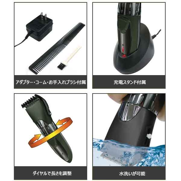 ● 充電式で使いやすい! 使用時はコードレスで取り回しがしやすく、自宅でのスタイリングやお子様の散髪などに大活躍! 便利な充電スタンド付き。 ● 水洗いOK! ヘッド部分は水洗いが可能。 使用後のお手入れが簡単で、清潔に保管できます。 ● 刈り高さ調節自在! 用途に合わせて、2種類のアタッチメントを付け替え可能。 また、本体のダイヤルで長さ調節も簡単。 こだわりのスタイルが決まるヘアカッター! ・ 4-16mmアタッチメント&18-30mm付属 ● アダプター・くし・お手入れブラシ付属 | ||